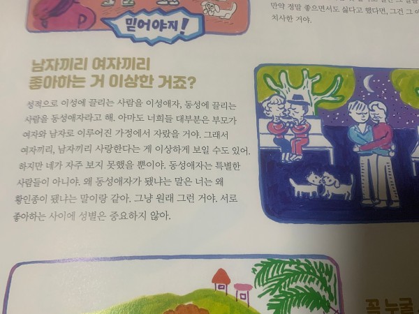 저는 평소에 아이들에게 하나님께서 남자와 여자를 창조하시고 서로 돕게하시고 그 모습을 하나님께서 기뻐하신다는 이야기를 자주 해주면서 동성애는 하나님께서 너무 싫어하시는 짓이라고 큰 죄라고 틈만나면 가르쳐온터라 우리 애가 이 책을 읽다가 이상했는지 저에게 책에 이상한 내용이 있다고 알려주어서 보게 되었어요..