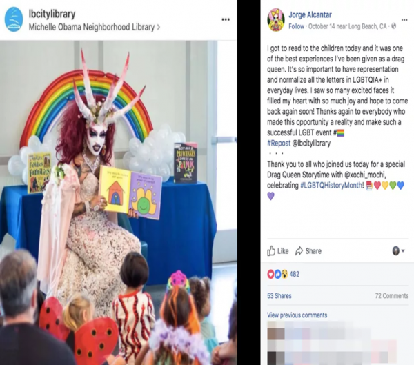 몇년전 캘리포니아 롱비치에 있는 미셀 오바마 네이버후드 도서실에서는 아래 그림과 같은 일이 일어났을뿐 아니라, 천사의 옷을 입은 사탄의 모습을 재현한 Jorge Alcantar이, “어린아이들에게 “LGBTQIA+ (동성애및 여러 변태적 성향들)을 읽어줄때 아이들의 반짝이는 눈빛이 너무 즐거웠다” 라는 아래처럼 글까지 남긴것으로 인해 수많은 사람들이 경악을 했었습니다.