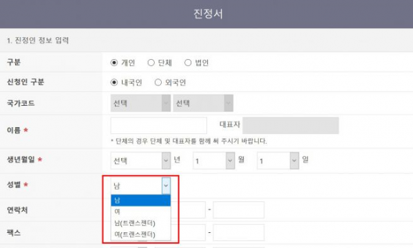 현재는 △남성 △여성 △남성(트랜스젠더) △여성(트랜스젠더) 4가지 항목 중 하나를 기입하도록 돼 있는데, 여기에 '지정되지 않은 성'이 추가되는 것이다. 인권위는 시스템 개선 작업 등을 통해 한 달 뒤부터 홈페이지에서 새로운 진정서 양식을 이용할 수 있도록 준비 중이다. 이 작업이 완료되면, 앞으로 성별란은 △남 △여 △지정되지 않음(직접 기입) 세 가지로 변경되게 된다.
