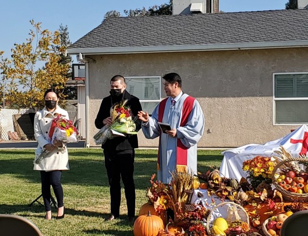 장희선 자매님의 입교와 마이클 형제님의 세례식 후 꽃다발 증정