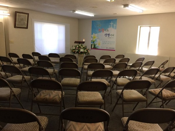 이제는 역사 속으로 사라질 친교실. 재건축하기 전 마지막으로 부활절 새벽예배를 드리기로 했다. 새벽예배를 위해 의자를 예배형으로 정돈한 모습.