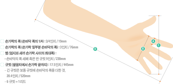 “손바닥 넓이(폭)”은 엄지손가락을 제외한 4 개의 손가락의 넓이로서 약 7.5cm입니다.